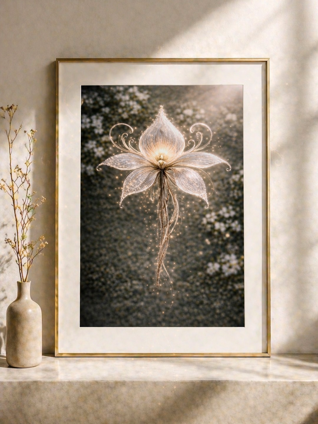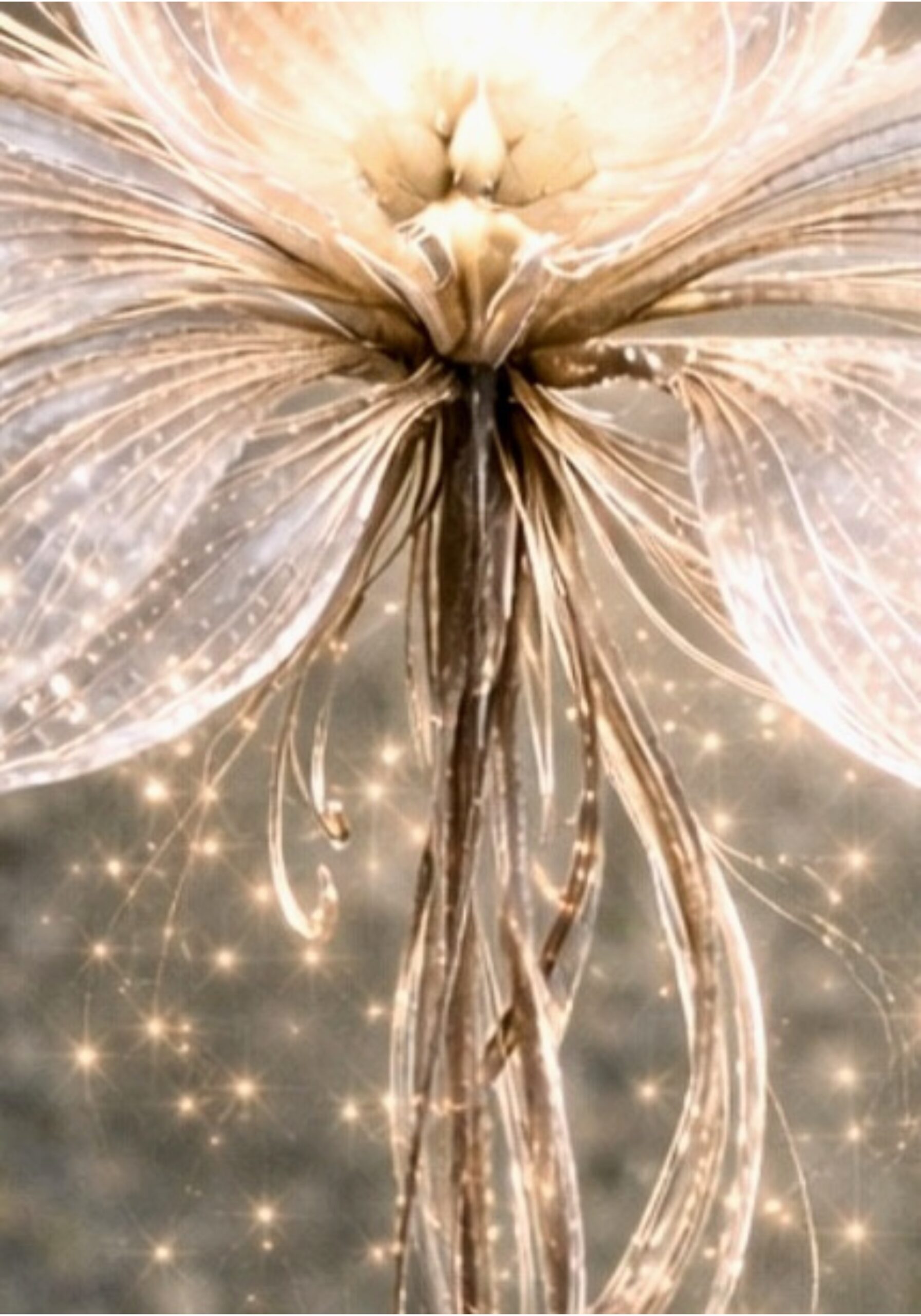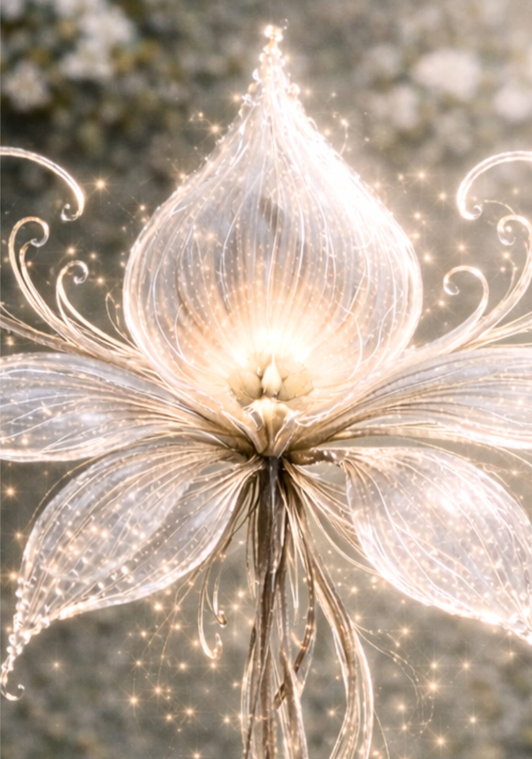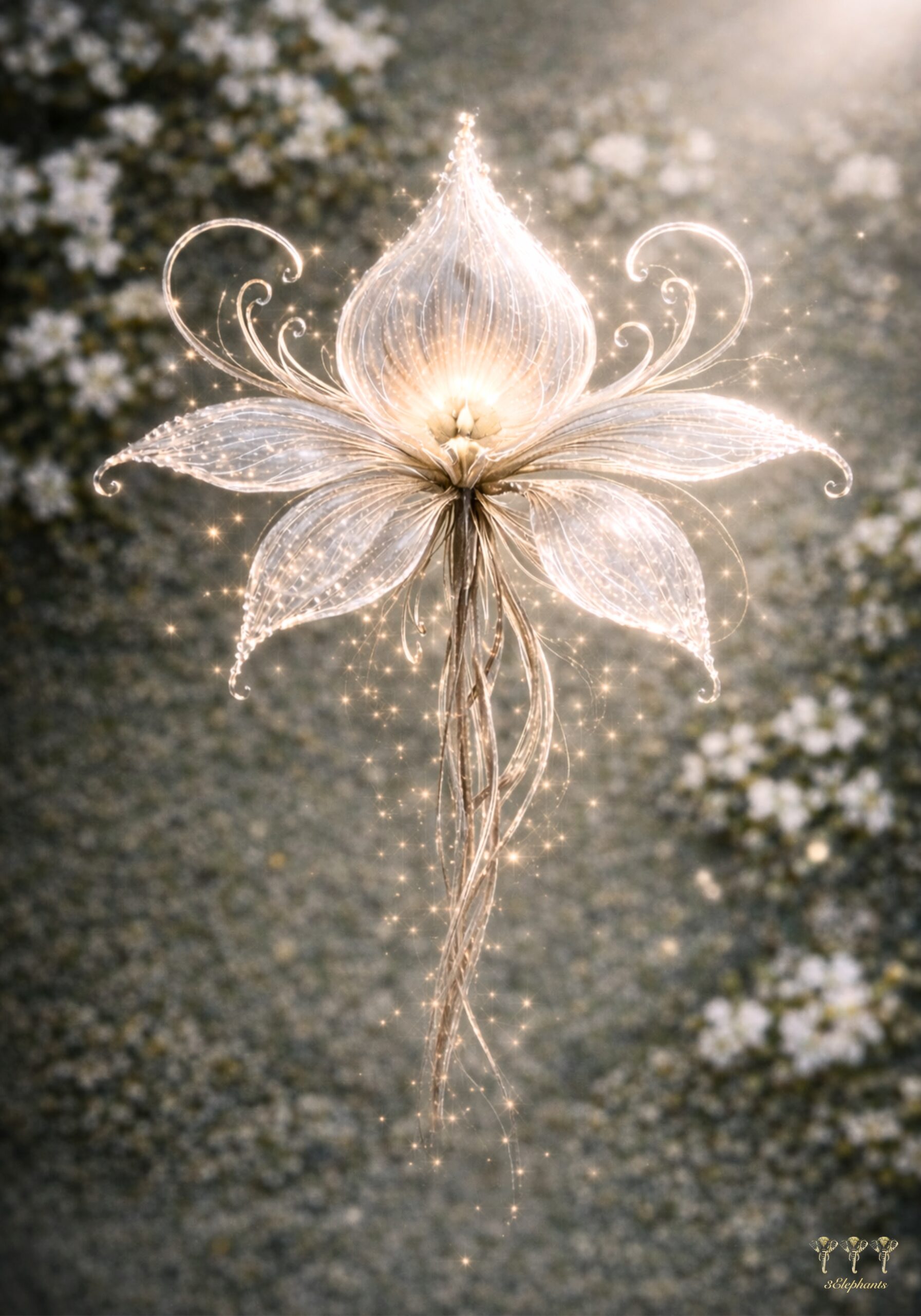 A single bloom shaped like unfolded wings. Delicate details suggest that something just about to emerge. Elegant and restrained, transformation in its earliest form.